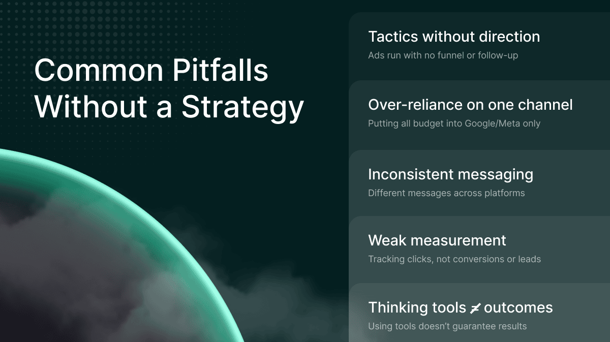 When businesses skip strategy and go straight to execution, that’s exactly when problems crop up. This often leads to wasted budget, poor performance, inconsistent messaging, and no real way to know what’s working.