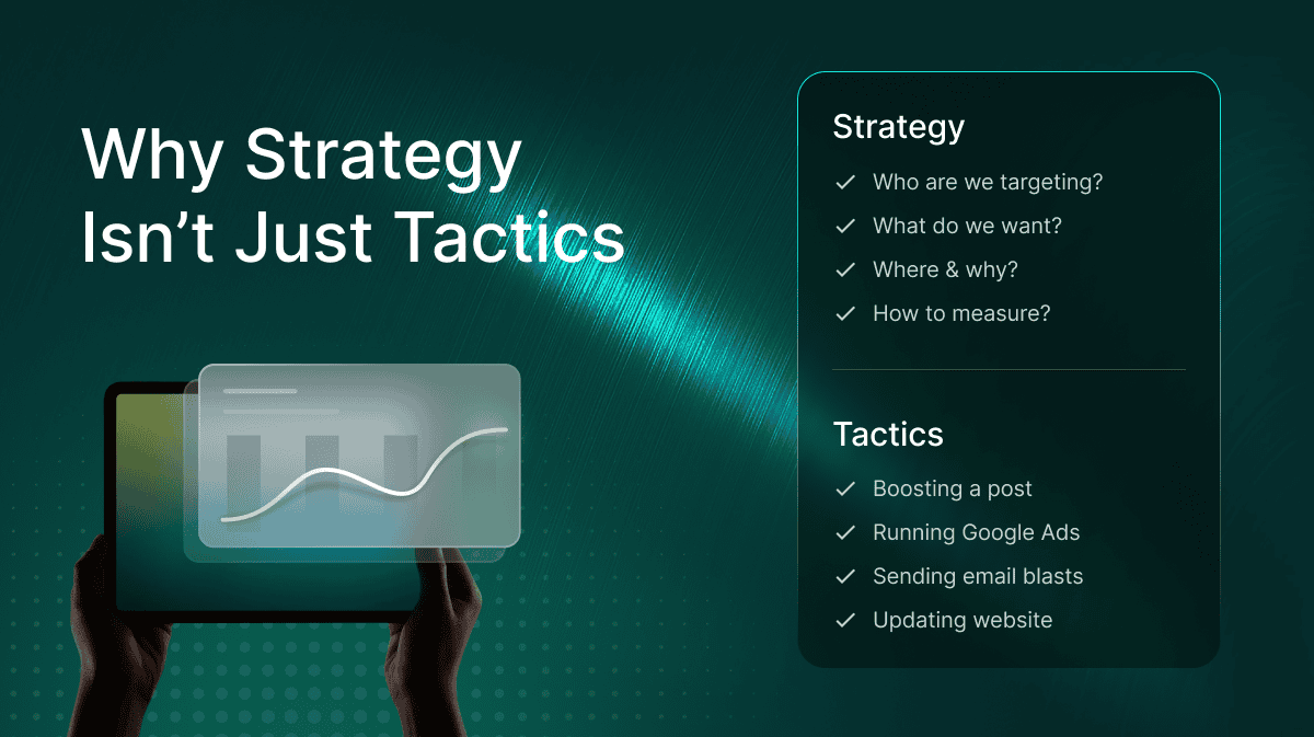 Here’s the thing, boosting a post, running a Google ad, or setting up an email campaign isn’t a strategy. Those are tactics. They’re the execution tools, not the thinking behind them.